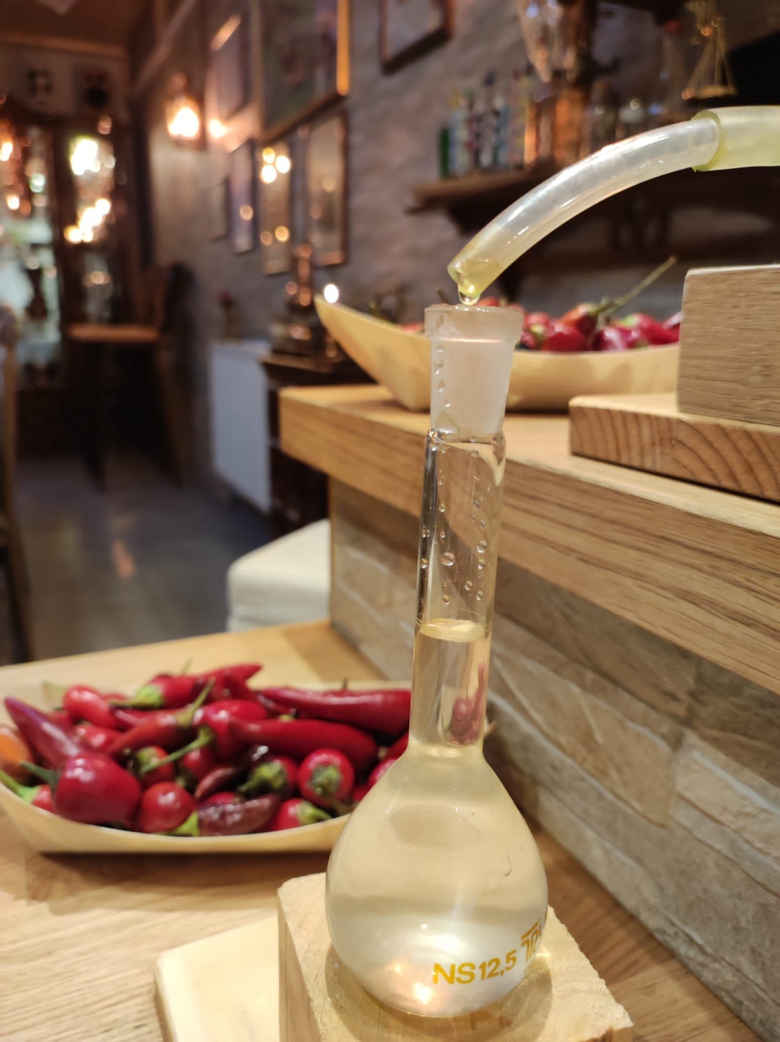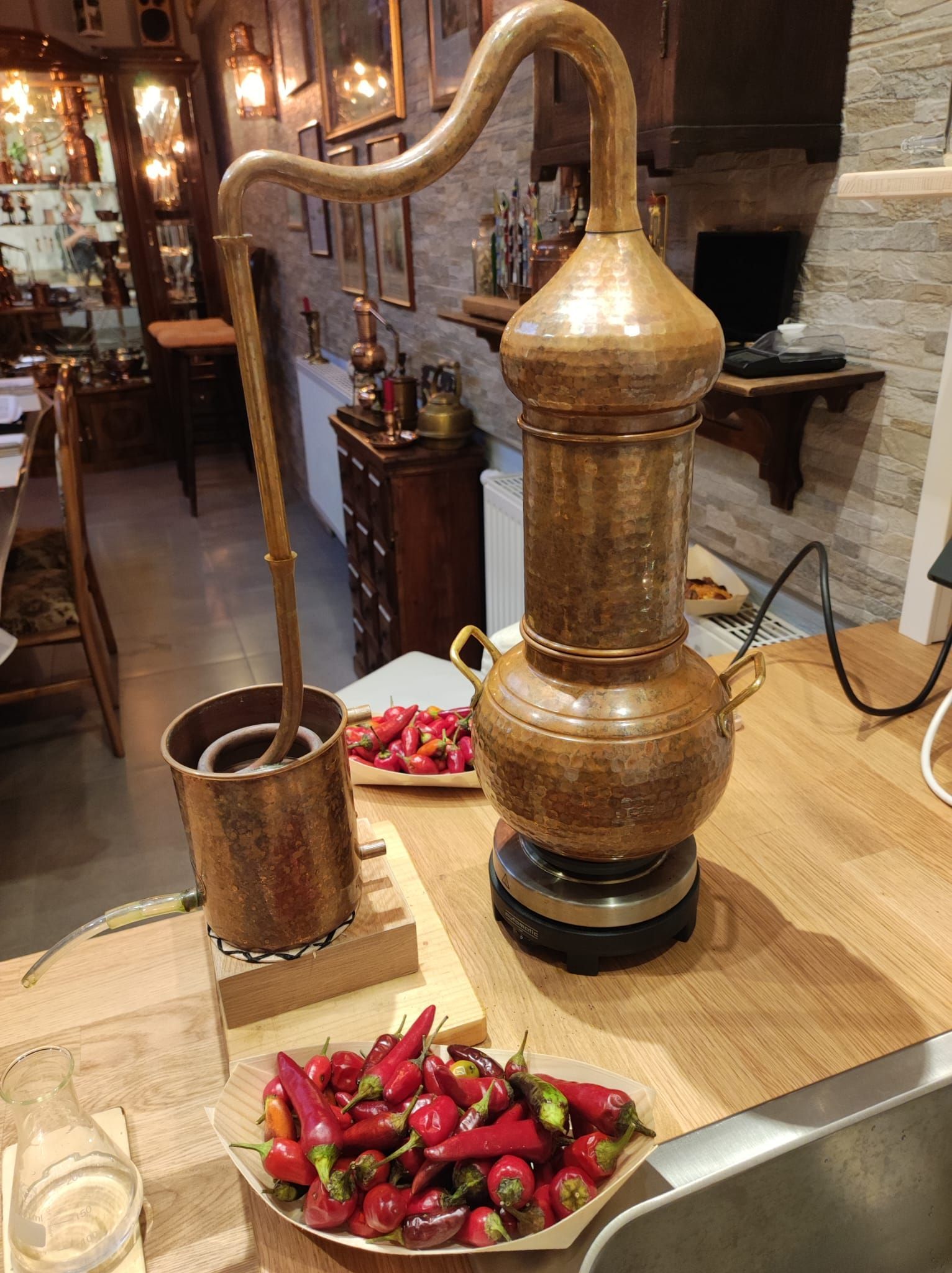 Dabei erzeugen wir ein erstaunliches, nach Paprika riechendes Hydrolat. Leider können wir kein ätherisches Öl gewinnen, lassen aber das Hydrolat mehrere Tage reifen und sind fasziniert, wie sich Geschmack und Schärfe entfalten.