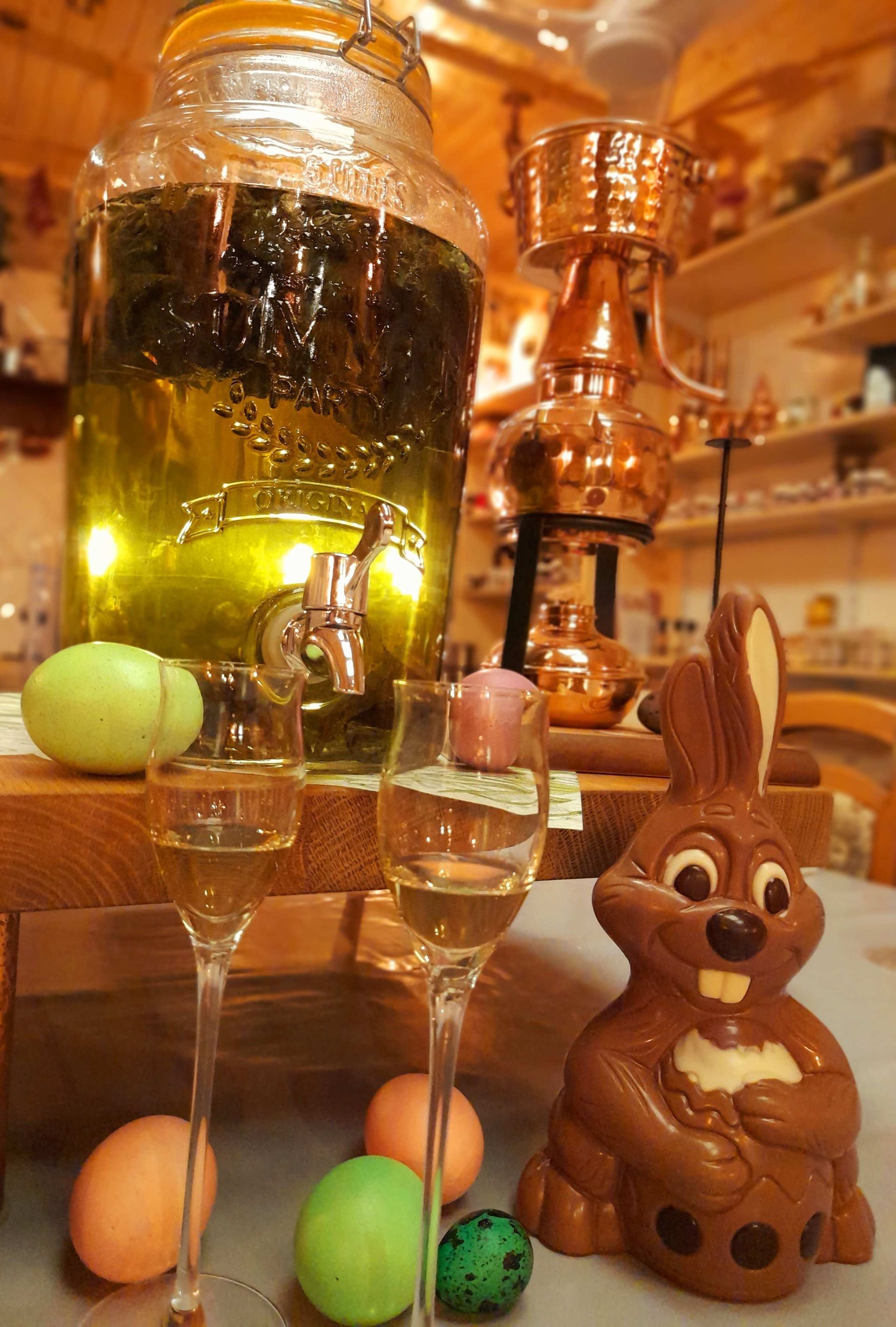 Wir verwenden nun 96%igen Weingeist einer Brennerei aus dem Süden Deutschlands, der mit destilliertem Wasser auf eine Trinkstärke von 40%Vol verdünnt wird. In einem großen Glas lassen wir die Kräutermischung mit diesem Aufguss ca. 4 Wochen reifen. Nun wird die Tinktur abgeseiht und wir erhalten einen bekömmlichen, herzhaften und unvergleichlichen Wildkräuter-Frühlingschnaps.