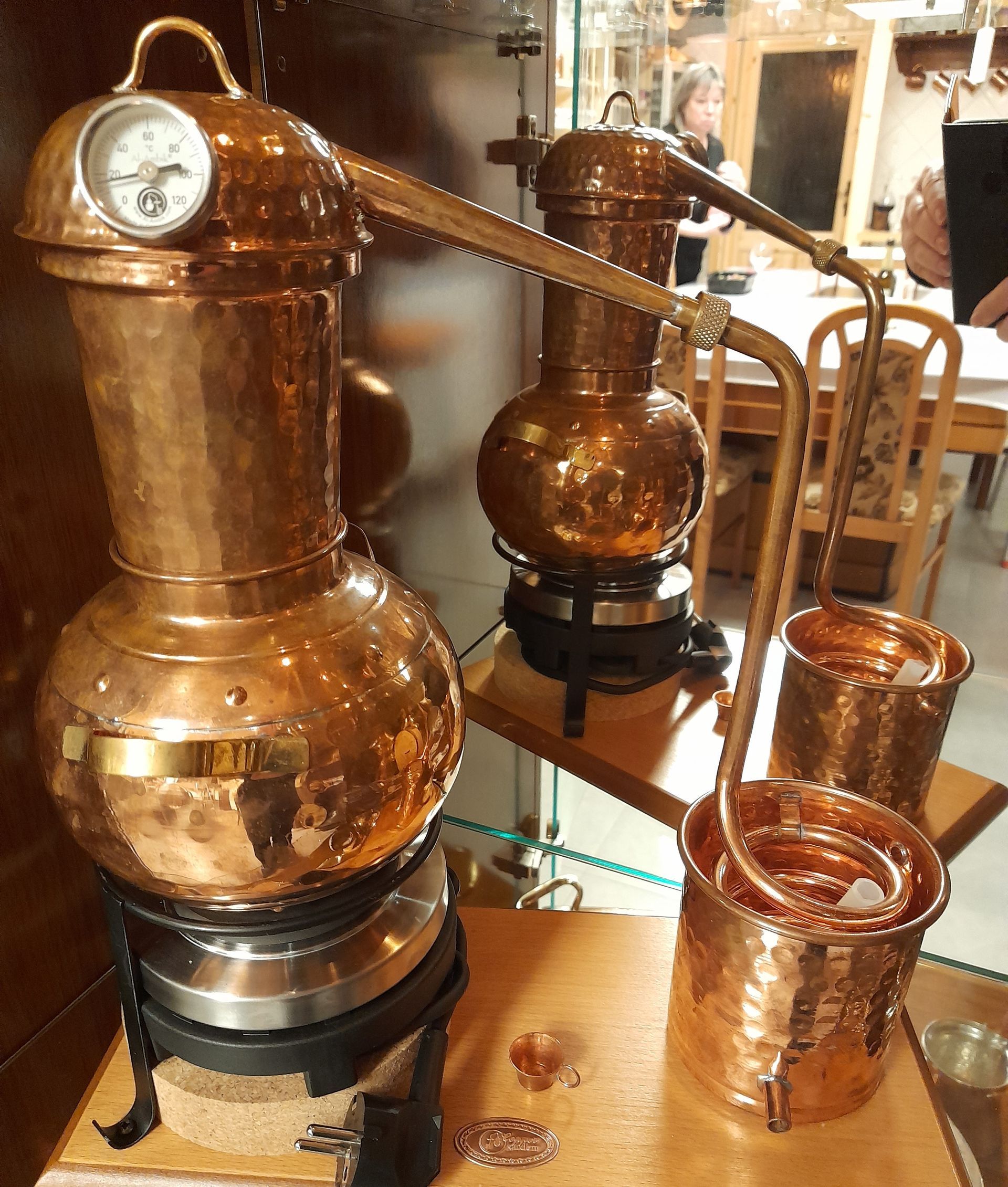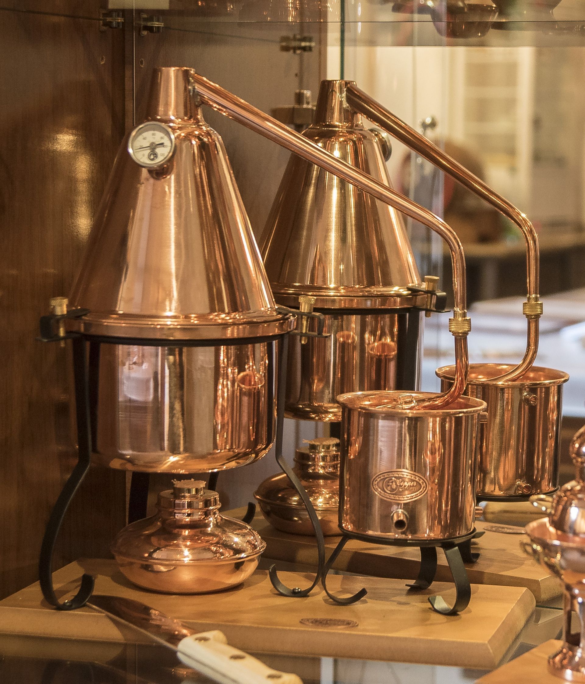 ...ist die Destille zur Aromaerzeugung! Mit den Vorbildern aus der Vergangenheit hat sie einiges am Hut, denn genau hier findet die Kühlung statt.