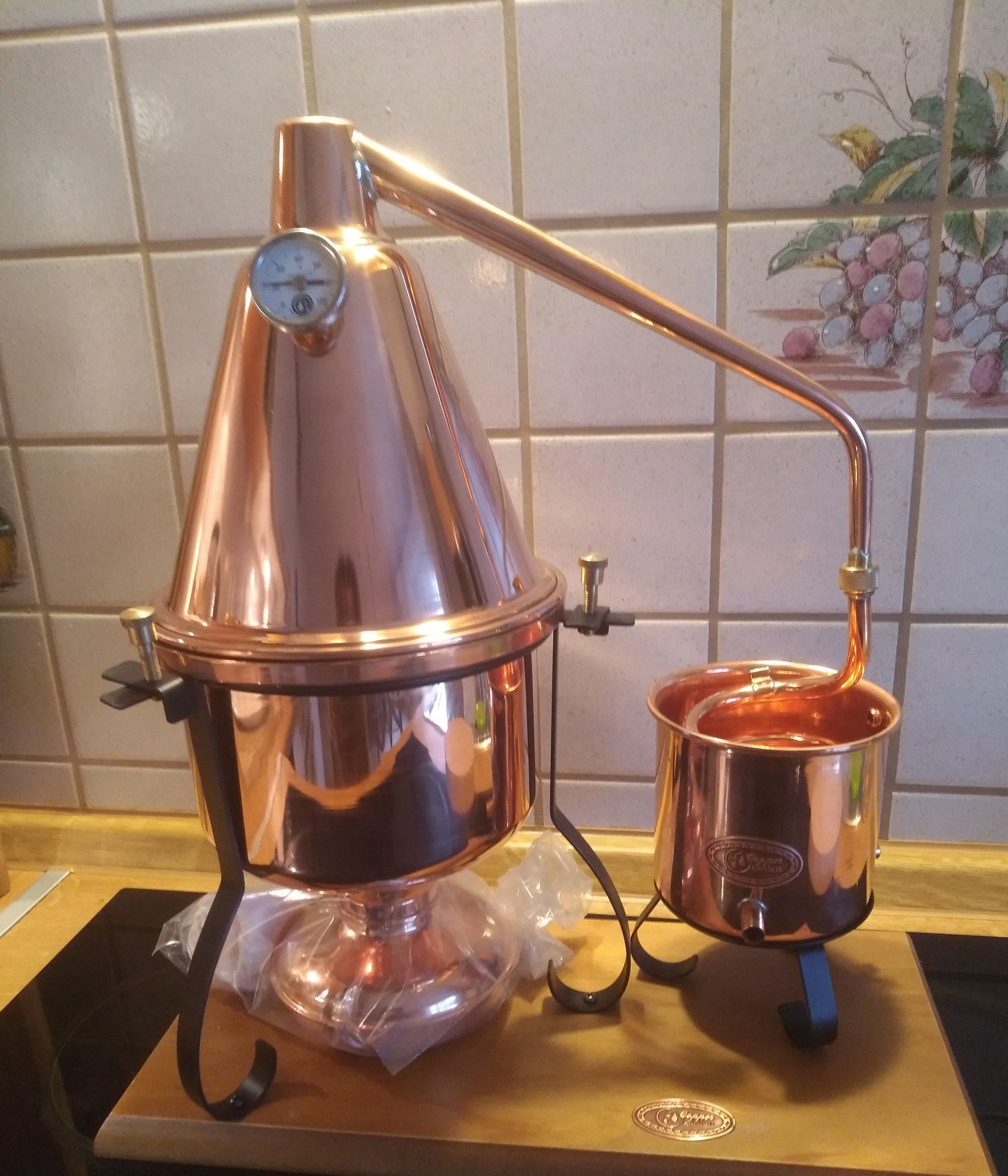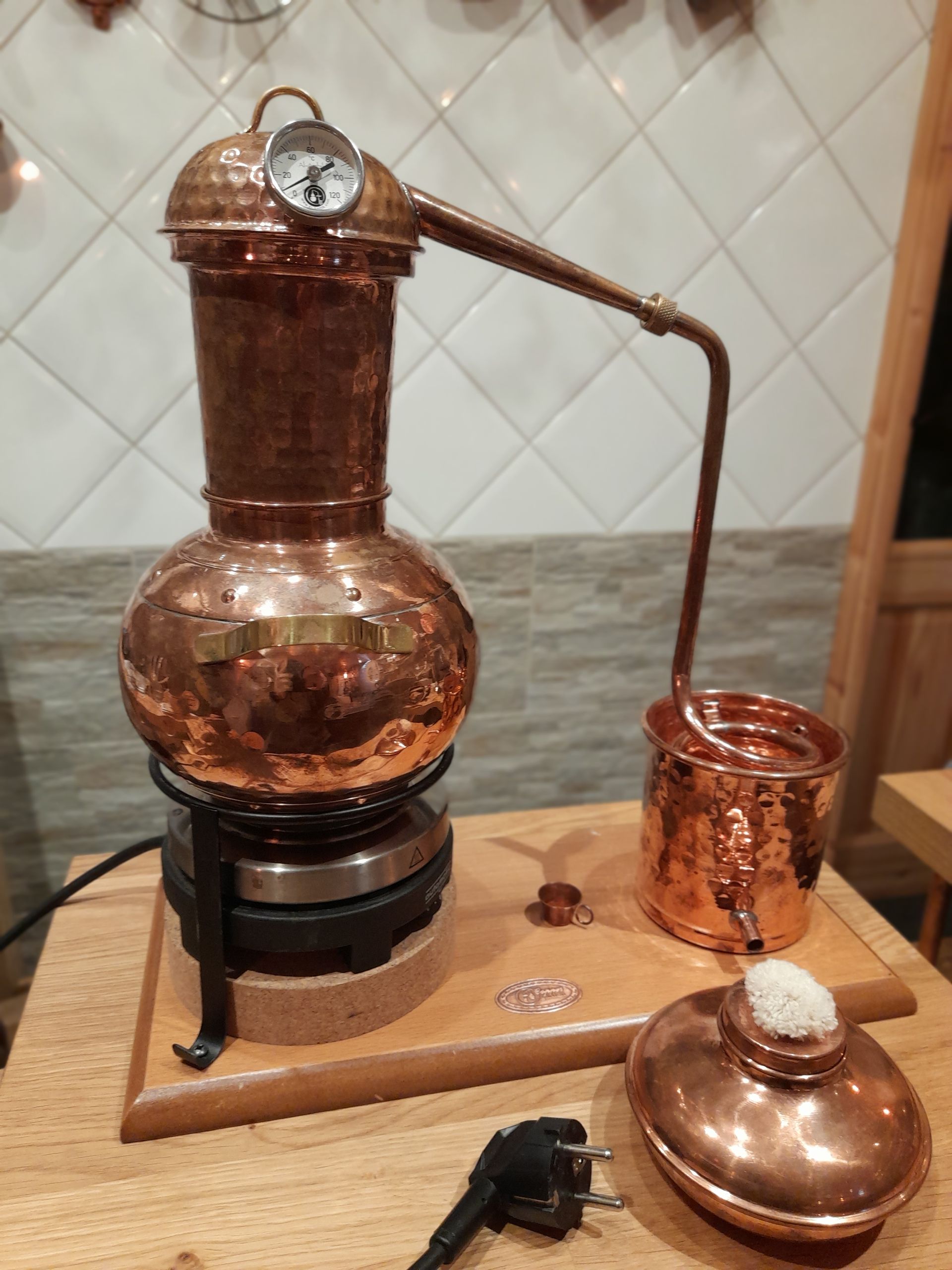 Der Aromakorb befindet sich im hoch gezogenen Hut, in dem die Pflanzen während der Destillation durchdampft werden. Zusätzlich existiert ein Auffüllstutzen im Brennkessel und der Kühlwasserbehälter ist etwas größer. Eine Augenweide ist der wunderschöne Spiritusbrenner, den wir auch zum Aufheizen kleiner Hexenkessel oder Fondues verwenden. Insgesamt eine sehr hochwertige Anlage, die mit ihren souveränen Destillierergebnissen über jeden Zweifel erhaben ist. Top-Qualität.