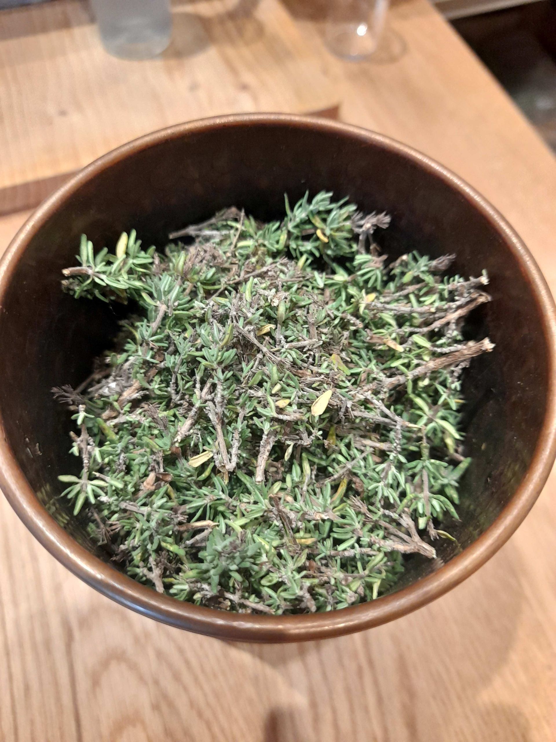 Der "Echte Thymian" oder Quendel ist eine Heil- und Gewürzpflanze und wächst in den warmen Teilen Europas und Asiens. Das bei der Destillation verströmende Aroma, weckt Erinnerung an alte Arztpraxen in meiner Kindheit, denn die enthaltenen Wirkstoffe im ätherischen Öl, haben schleimlösende Eigenschaften und werden bei Atemwegserkrankungen angewendet. Die antibakterielle und antiseptische Wirkung nutzten schon die Römer, zum Reinigen ihrer Häuser und als Libido förderndes Aphrodisiakum, in ihren antiken Bädern. Auch die Griechen und Ägypter bedienten sich der Pflanze, z.B. als keimtötendes Räuchermittel zur Insektenabwehr oder zur Mumifizierung ihrer Ahnen.