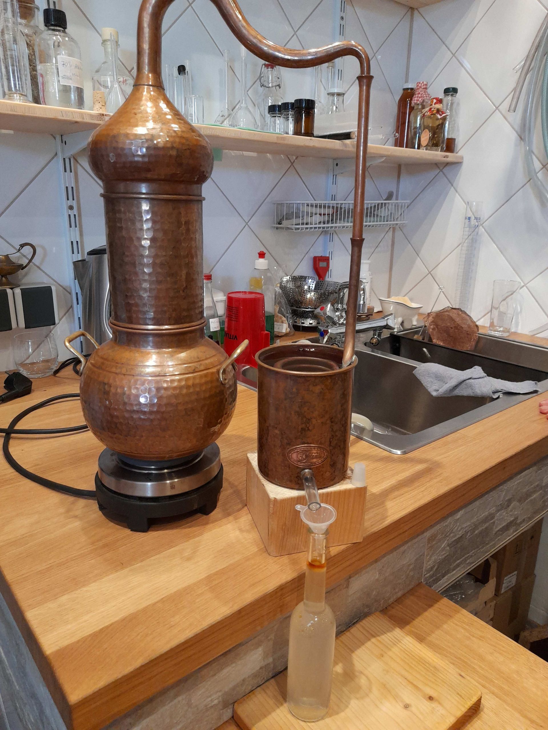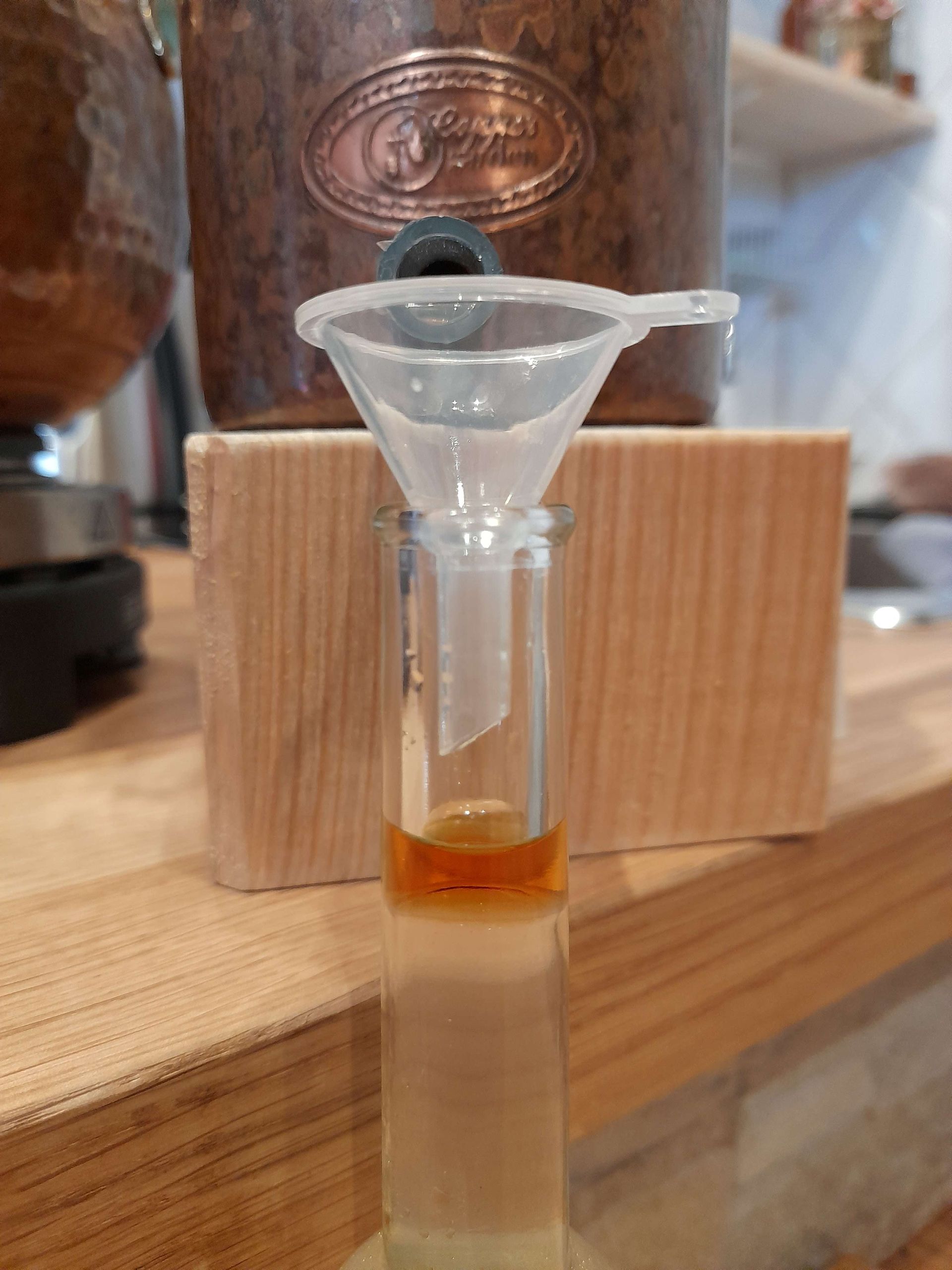 Wir destillieren 130g frisch geerntetes Pflanzenmaterial und es bildet sich auf dem Hydrolat 1,5ml wunderbares, orangebraunes ätherisches Öl. Somit liegt die Ausbeute bei 1,2% welches mich durchaus zufrieden stimmt. Das ätherische Öl kann hautreizend sein und sollte nur verdünnt (mit Trägeröl) angewendet werden. Mit seinen antifungiziden und antiparasitischen Eigenschaften kann es Läuse und Hautwarzen vertreiben.