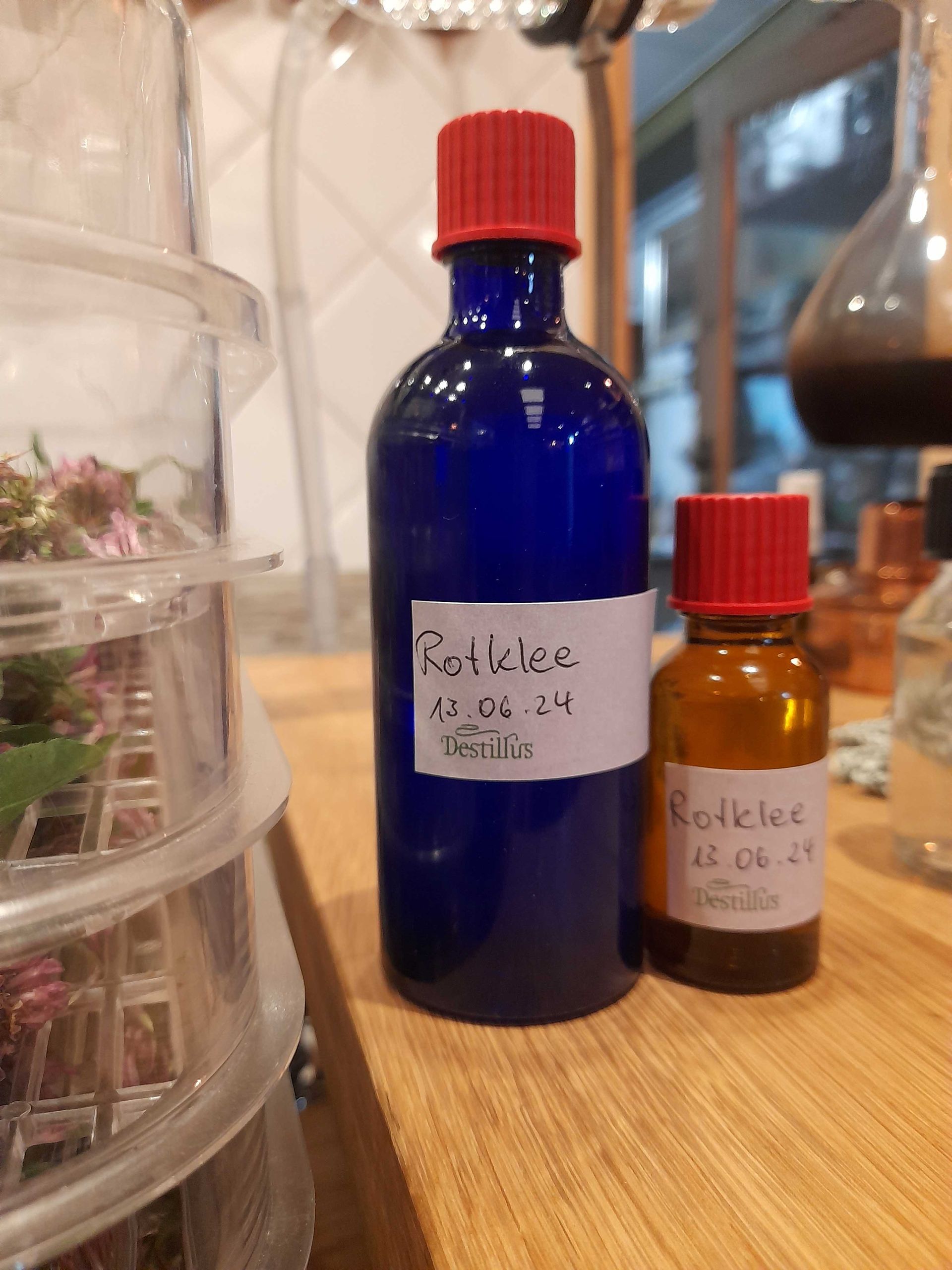 Auf einer halbschattigen Wiese in Oberweißbach konnten wir reichlich Rotklee-Blüten ernten. Zurück im Destillierladen, wartete unsere Destille „Essence“ schon ganz ungeduldig, auf ihren Einsatz. Nach dem Starten der Wasserdampf-Destillation erzeugte sie völlig entspannt, feinstes Rotklee-Hydrolat. Ätherisches Öl gab es keines, der pH-Wert lag bei etwa 5,5 und somit im gewünschten sauren Bereich.