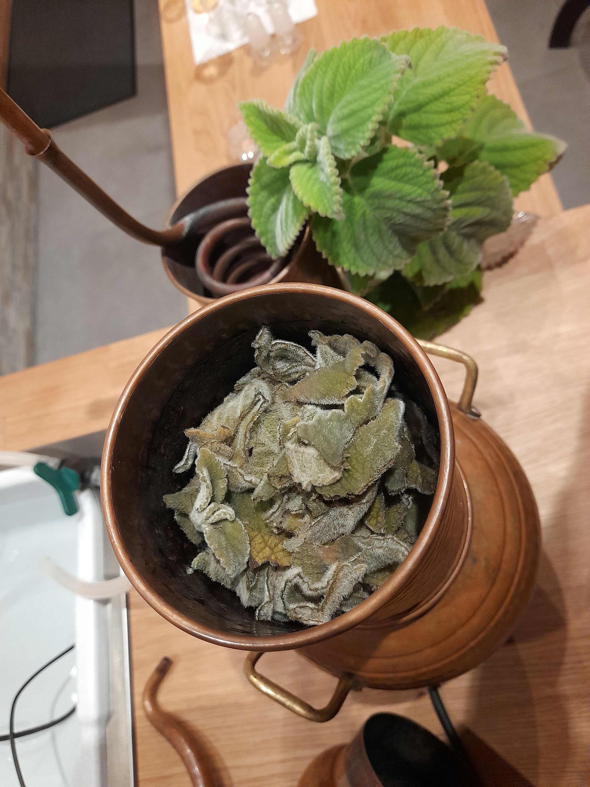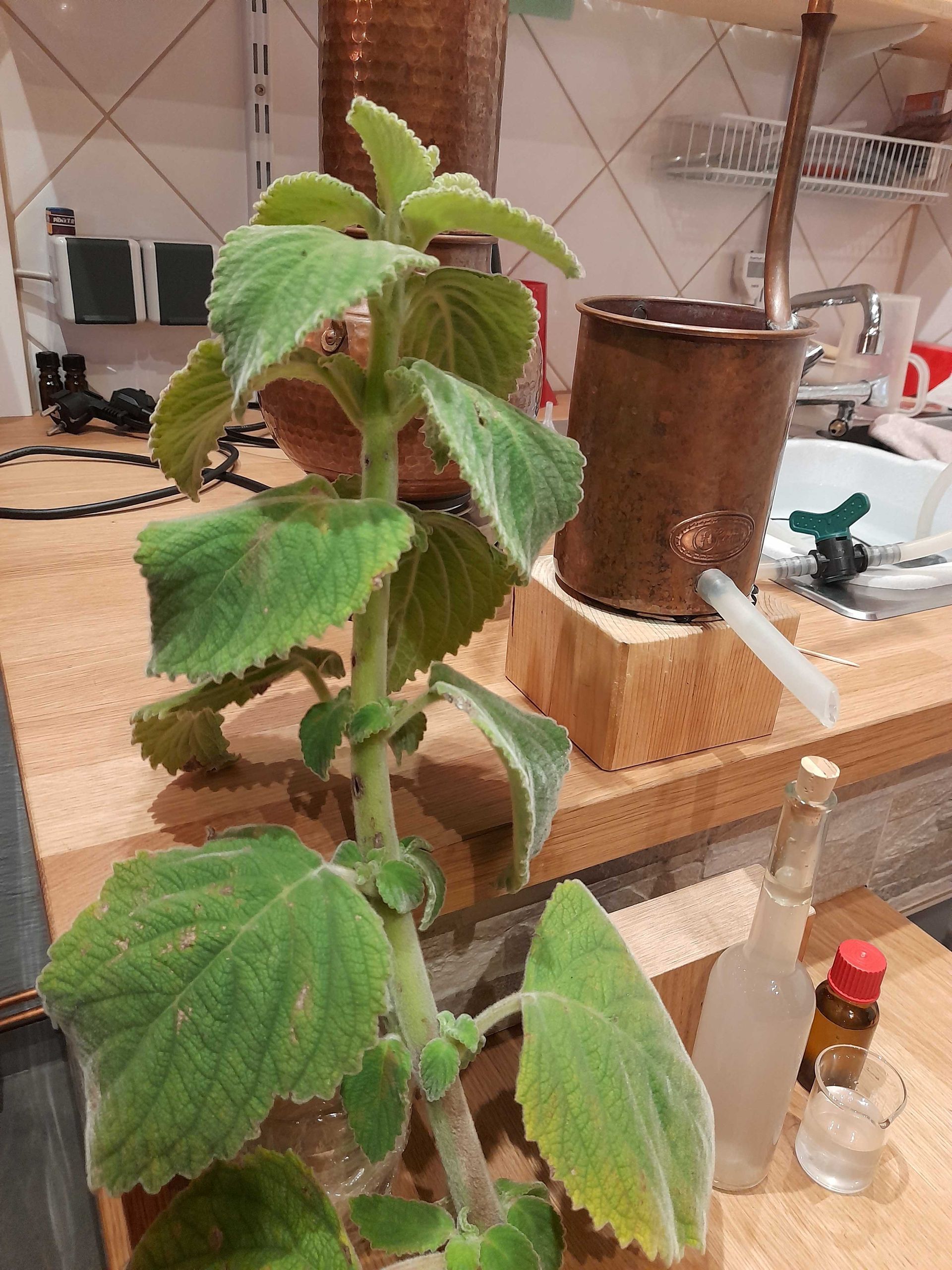 Unsere Wahl viel auf ein Gewächs, welches im Frühjahr ins Hochbeet kam und dort prächtig gedeihte. Beim Reiben der flauschigen Blätter, macht sich ein zitrusartiger Duft breit und unsere Destille wartete ungeduldig darauf, diesen einzufangen.