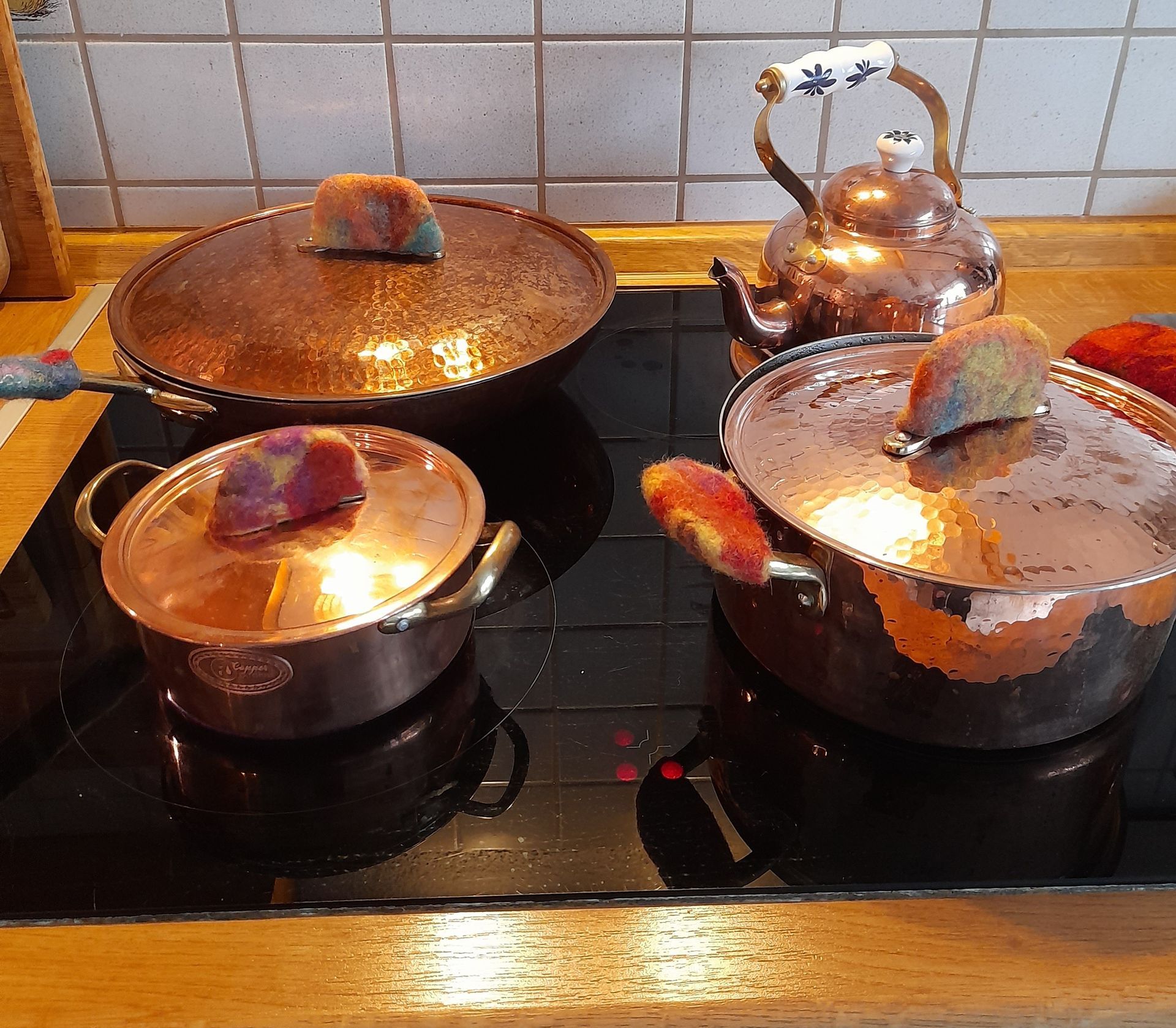 Nun konnten wir mit einer kleinen thüringischen Filzwerkstatt passgenaue Hitze-Stopper entwickeln, die sich an Griffe und Pfannenstile anschmiegen.