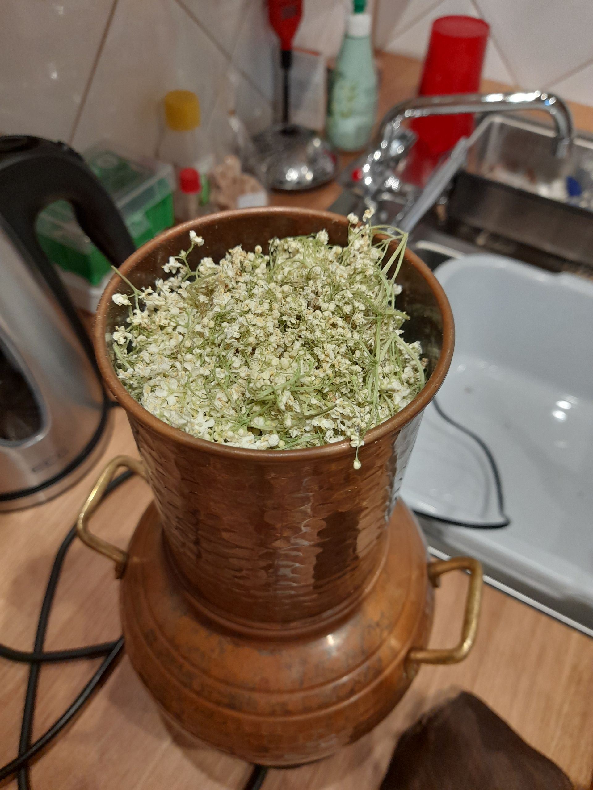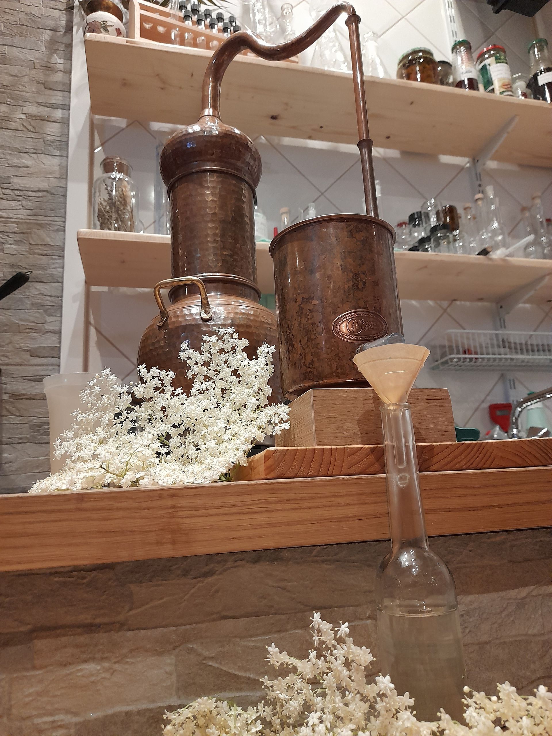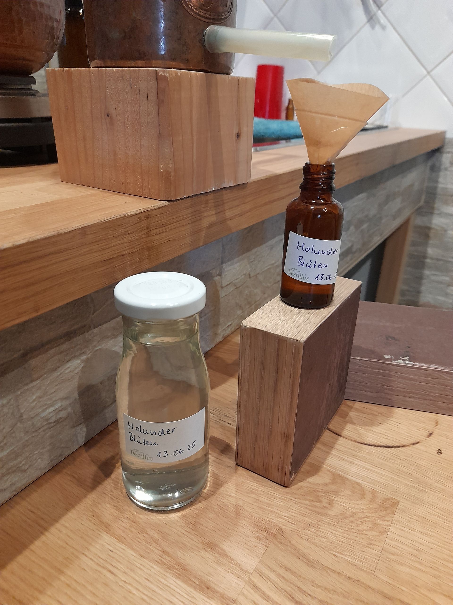 Wir ernten die Blüten und lassen sie einen Tag im Korb antrocknen. Nach dem Befüllen und Anheizen unserer Destille "Essence" rinnt ein glasklares Holunderblüten-Wasser heraus. Dieses duftet wunderbar und wird vor allem, aus der Tropfflasche, gegen Erkältungskrankheiten angewendet. Ätherisches Öl konnten wir nicht erzeugen.