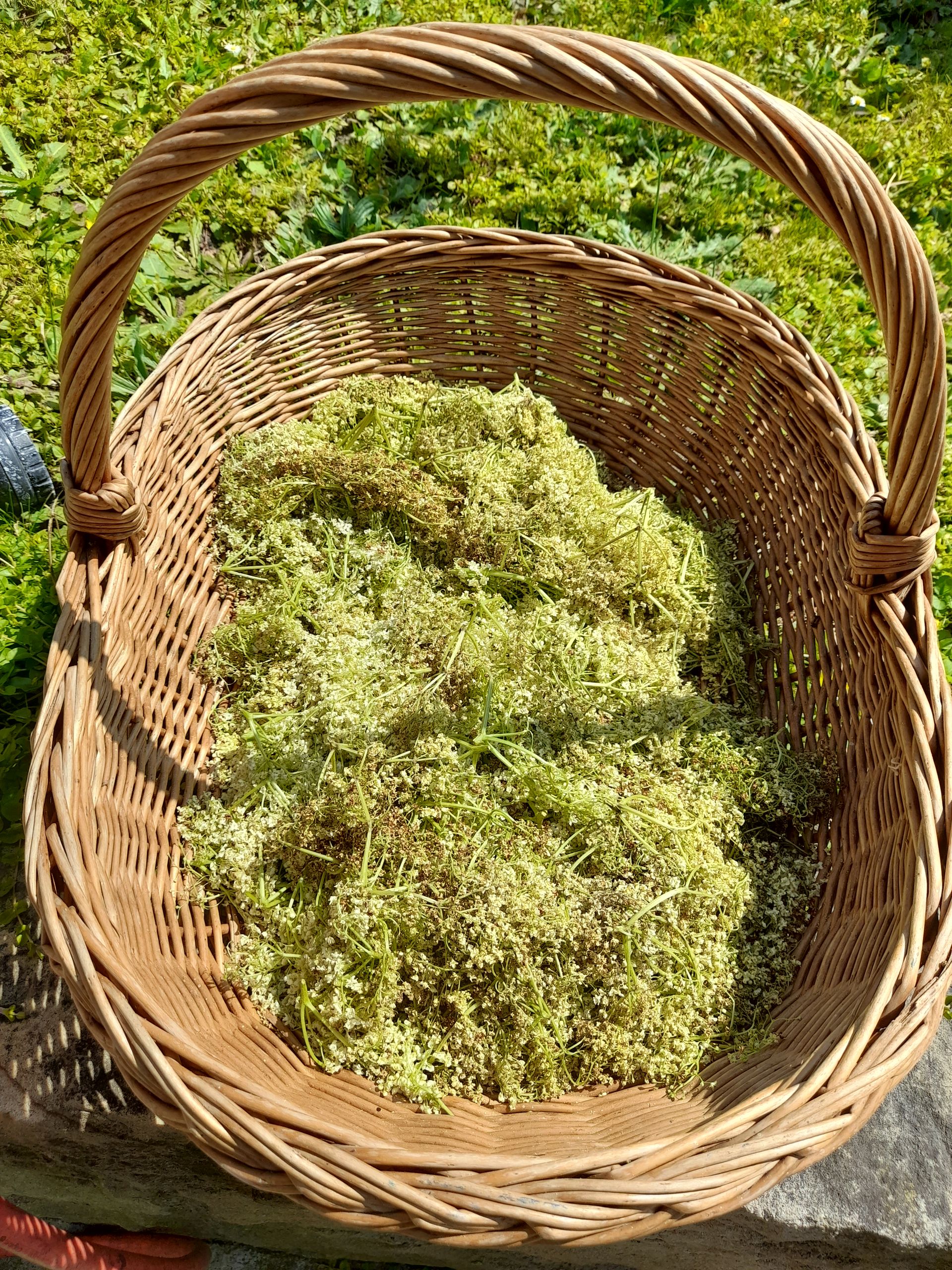 Die weitere Ernte wird getrocknet und im Mandel-Öl mazeriert. Das so gewonnene Holunderblüten-Öl wird als Zutat zur Cremeherstellung verarbeitet.
